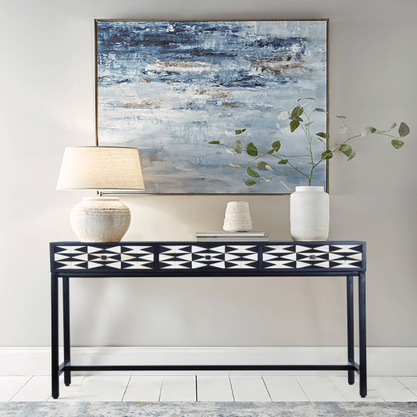 Offering a contemporary twist on a midcentury-inspired silhouette, this console features an external metal element that frames its leg. Understated balck hardware complements the beautiful inlay without clashing or distracting, while inlaid bone drawer fronts add a layer of texture that draws the eye. Whether placed in an entryway or living room as a console, or used as a desk for an at-home workspace, this sophisticated piece flows effortlessly into modern, eclectic, and minimalist spaces alike.